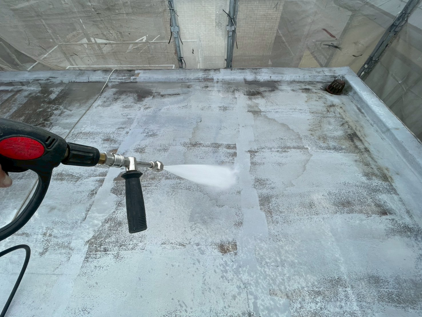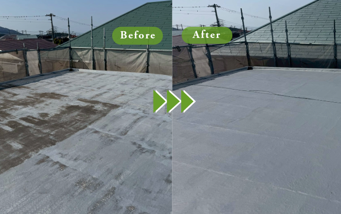 今回のお宅は、陸屋根構造で勾配が比較的ゆるやかなため、細部までしっかりと高圧洗浄を行い、汚れや劣化部分を丁寧に除去したうえで、防水塗装を施工いたしました。下地を整えることで、防水性能をしっかりと発揮できるよう仕上げております。