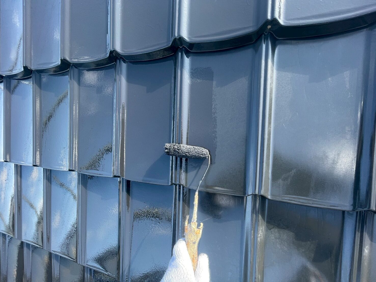 また、金属瓦は凹凸や重なり部分が多く、塗り残しが出やすい構造です。そうした箇所にも丁寧に塗料を行き渡らせるため、下塗り・中塗り・上塗りの工程を一つひとつ確実に行い、厚みのあるしっかりとした仕上がりに仕上げております。