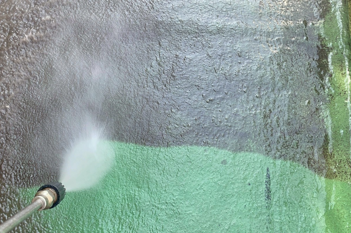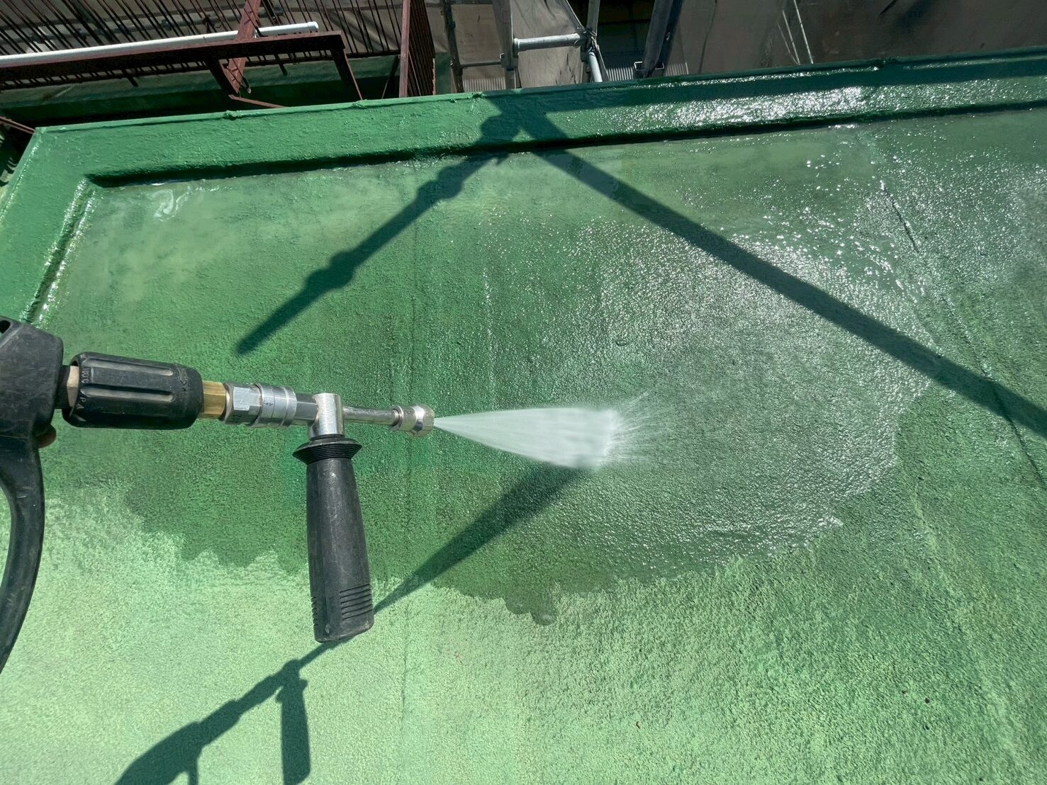 今回のお住まいは陸屋根(ろくやね)構造。平らな形状のため、雨水や落ち葉・ゴミが溜まりやすく、排水機能の維持がとても重要です。高圧洗浄の際には、表面をきれいにするだけでなく、雨樋や排水管の通管作業を念入りに実施。屋根洗浄後にも再度確認を行い、詰まりや流れの不具合がないか細かくチェックしました。