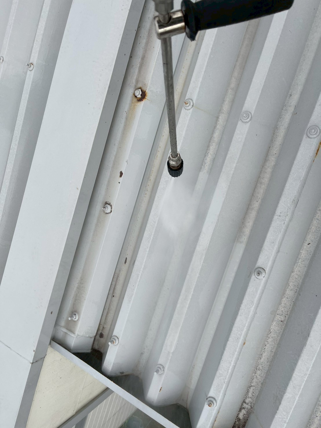 今回の屋根は、折半(折板)屋根。金属製のため耐久性は高いものの、長年の使用により色褪せや錆の発生が見受けられる状態でした。