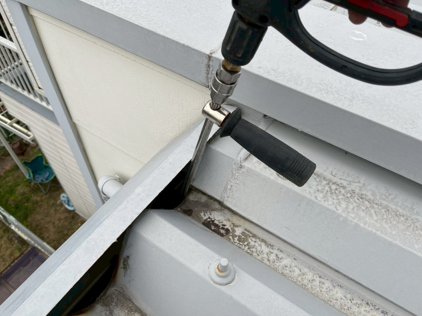 塗装前には、高圧洗浄を実施し、これまでに蓄積された汚れやホコリ、細かなゴミまで丁寧に除去。あわせて雨樋の通管清掃も行い、水の流れをしっかり確保しました。下地を整えることで、塗料の密着性と仕上がりの品質を高めています